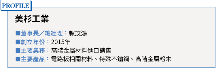 從新加坡轉戰台灣,成立於2015年的美杉工業,專注於電路板材料、特殊不鏽鋼與高階金屬粉末三大核心領域,不僅提供關鍵原料,更參與研發初期,透過前端介入與後端整合,成為上下游之間不可或缺的策略夥伴。面對瞬息萬變的全球供應鏈,美杉穩健前行,不追求規模最大,而是在利基市場中成為「被需要的角色」。