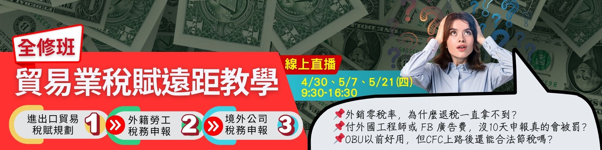 課程資訊 課程內容 效益及對象 時間地點 學員好評 備註說明 課程內容一、課程1:國貿交易與保稅區廠商之稅賦時間:4/30(四)9:30-16:301.進口貿易之營業稅申報1-1進口貨物、勞務、佣金之各式態樣1-2進口原物料,加工後於國內移運之營業稅申報1-3進口貨物的營業稅申報與應注意事項1-4進口貨物折讓與退回之營業稅申報處理1-5進口勞務、進口佣金的營業稅申報與應注意事項1-6漏報進口營業稅與關稅之查核與不得違法提醒2.出口貿易之營業稅申報2-1出口貨物、勞務、佣金之各式態樣2-2進口原物料,加工後出口海外之營業稅退稅申報2-3出口貨物的營業稅退稅申報與應注意事項2-4出口貨物獨立申報、併櫃移運之營業稅申報事項2-5出口貨物但委託第三方組裝、併櫃移運之營業稅申報事項2-6出口貨物折讓與退回之營業稅申報處理2-7出口勞務、出口佣金的營業稅退稅申報與應注意事項2-8出口樣品或禮品的處理方式與應注意事項2-9外銷相關之視同銷貨處理模式與應注意事項2-10零稅率退稅查核與因應3.多角貿易之營業稅申報3-1申報範圍與態樣(第三地交貨與下單、居間與買賣)3-2境外固定資產租賃之營業稅申報應注意事項3-3接單後,委由第三方進出口之營業稅申報4.保稅區廠商之營業稅申報4-1保稅區廠商移運:納入海關監理、脫離海關監理(出境、進入課稅區、保稅區交易)4-2保稅區廠商三角貿易態樣解析5.國際貿易之銷售額與營業收入調節5-1預收貨款、上期預收款轉收入之調節5-2本期應收、上期應收未申報外銷勞務之調節5-3境外交易之調節5-4受託代銷第三地之調節5-5境外加工之調節5-6境外倉庫之調節6.國際貿易之各類所得扣繳申報應注意事項6-1一般扣繳(支付境內員工薪資、租金、執行業務收入…等)6-2就源扣繳(支付外國員工薪資、外國公司廣告費、國外佣金等)7.國際貿易之營所稅申報應注意事項7-1財稅上的差異問題(如:境外壞帳、匯兌損益)7-2營業稅銷售額與營所稅銷貨收入之外貿差異7-3書審申報(如:適用要件、申報方式)7-4查帳申報(如:成本認列、海外差旅費認列、外銷佣金認列、外銷損失認列)7-5簽證申報(如:適用要件、申報方式)二、課程2:外籍勞工所得與支付外企扣繳申報時間:5/7(四)9:30-16:301.支付外國稅務居民(企業、勞工)扣繳判斷的關鍵1-1中華民國來源所得(境內所得)的類別1-2應就源扣繳的境內所得項目1-3各項所得的就源扣繳稅率、扣繳申報的時間1-4外國個人、境外營利事業(固定場所、代理人)於扣繳時的差異1-5境外稅務居民的國外抵稅權1-6給付企業代吸收扣繳稅金的計稅恆等式2.就源扣繳稅款的合法減免方案2-1四大業務範圍(國際運輸、工程包工、技術服務、出租設備)核定所得額2-2二大所得來源(勞務報酬、自營所得)依境內貢獻度、淨利率核定所得額2-3權利金、建廠技術服務費申請專案免稅2-4適用租稅協議的收入來源(海運、空運、權利金、利息、股利)3.外國勞工的薪資就源扣繳解析3-1外國勞工居留天數 (183天以內 VS 183天以上)的判斷3-2外國勞工身份轉變(境內稅務居民)的扣繳方式3-3外國勞工提前離境的扣繳處理方式3-4非屬外國勞工境內所得的薪資態樣3-5支付外國勞工薪資的企業二代健保3-6相關給付外國勞工案例與解釋函令說明4.執行業務收入就源扣繳解析4-1境外個人(境外事務所) vs 境外營利事業:執業收入定義與扣繳方式4-2給付企業自行吸收扣繳稅款的計稅方式4-3非屬境內執業的態樣(律師境外訴訟、會計師境外簽證、機構境外檢測)5.股利收入就源扣繳解析5-1現金股利的就源扣繳程序5-2股票股利的扣繳稅款處理方式5-3大陸股東、非大陸股東的扣繳稅率5-4取消兩稅合一後的影響與案例6.權利金就源扣繳解析6-1授權使用(授權軟體)、買斷權利(買斷軟體)的差異6-2權利金、服務費的差異6-3權利金的扣繳方式、專案免稅的適用要件6-4給付企業自行吸收扣繳稅款的計稅方式7.跨境電子勞務交易(跨境電商)扣繳解析7-1跨境電子勞務定義:境外電商廣告費、雲端硬碟使用費、訂房網平台費…等7-2跨定電子勞務交易的境內所得 VS 非屬境內所得案例7-3跨境電子勞務交易的境內貢獻度、獲利率、扣繳稅率7-4給付企業自行吸收扣繳稅款的計稅方式7-5企業自行申請適用跨境電子勞務扣繳說明8.支付境外軟體服務費扣繳解析8-1支付境外套裝軟體費之扣繳8-2支付境外套裝軟體之年費(SAAS)扣繳8-3支付境外單機版軟體之扣繳8-4支付境外客製化軟體之授權扣繳8-5支付境外客製化軟體之勞務扣繳9.其他境內所得來源扣繳解析9-1租金收入:向外國人承租境內資產的租賃給付9-2利息收入:支付外國人借款利息的扣繳9-3外銷佣金:外銷佣金免扣繳的態樣與應備文件9-4進口佣金:境口佣金應扣繳的態樣與常見疏失9-5服務收入:諮詢費、境外證券募集服務、外勞人力仲介派遣等9-6其他需要境內企業協力的所得9-7其他非屬境內所得的態樣(境外門票、商標登記、檢測等)10.常見漏扣漏報就源扣繳的違反案例10-1案例解析與違法問題10-2漏未扣繳申報的罰則10-3連動二代健保的討論三、課程3:境外公司OBU操作與反避稅CFC因應時間:5/21(四)9:30-16:301.資金來源對境外公司稅賦的影響1-1貿易金流:營業稅、營所稅、CFC之影響解析1-2投資金流:CFC之影響解析2.常見誤解說明與解析2-1境外公司的租稅天堂免稅優惠2-2OBU帳戶免稅優惠與隱蔽效益2-3海外帳戶免稅優惠與隱蔽效益2-4OBU匯回性質