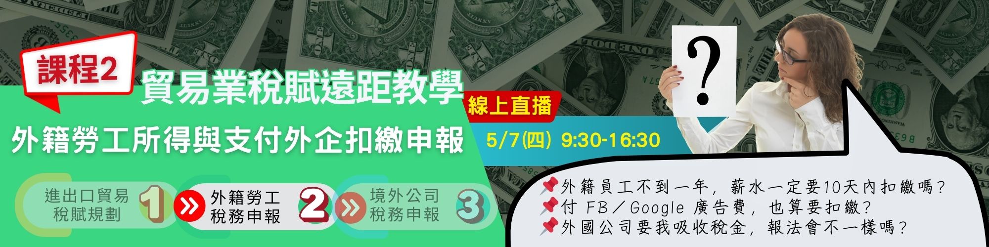 課程資訊 課程內容 效益及對象 時間地點 學員好評 備註說明 課程內容課程2:外籍勞工所得與支付外企扣繳申報時間:5/7(四)9:30-16:301.支付外國稅務居民(企業、勞工)扣繳判斷的關鍵1-1中華民國來源所得(境內所得)的類別1-2應就源扣繳的境內所得項目1-3各項所得的就源扣繳稅率、扣繳申報的時間1-4外國個人、境外營利事業(固定場所、代理人)於扣繳時的差異1-5境外稅務居民的國外抵稅權1-6給付企業代吸收扣繳稅金的計稅恆等式2.就源扣繳稅款的合法減免方案2-1四大業務範圍(國際運輸、工程包工、技術服務、出租設備)核定所得額2-2二大所得來源(勞務報酬、自營所得)依境內貢獻度、淨利率核定所得額2-3權利金、建廠技術服務費申請專案免稅2-4適用租稅協議的收入來源(海運、空運、權利金、利息、股利)3.外國勞工的薪資就源扣繳解析3-1外國勞工居留天數 (183天以內 VS 183天以上)的判斷3-2外國勞工身份轉變(境內稅務居民)的扣繳方式3-3外國勞工提前離境的扣繳處理方式3-4非屬外國勞工境內所得的薪資態樣3-5支付外國勞工薪資的企業二代健保3-6相關給付外國勞工案例與解釋函令說明4.執行業務收入就源扣繳解析4-1境外個人(境外事務所) vs 境外營利事業:執業收入定義與扣繳方式4-2給付企業自行吸收扣繳稅款的計稅方式4-3非屬境內執業的態樣(律師境外訴訟、會計師境外簽證、機構境外檢測)5.股利收入就源扣繳解析5-1現金股利的就源扣繳程序5-2股票股利的扣繳稅款處理方式5-3大陸股東、非大陸股東的扣繳稅率5-4取消兩稅合一後的影響與案例6.權利金就源扣繳解析6-1授權使用(授權軟體)、買斷權利(買斷軟體)的差異6-2權利金、服務費的差異6-3權利金的扣繳方式、專案免稅的適用要件6-4給付企業自行吸收扣繳稅款的計稅方式7.跨境電子勞務交易(跨境電商)扣繳解析7-1跨境電子勞務定義:境外電商廣告費、雲端硬碟使用費、訂房網平台費…等7-2跨定電子勞務交易的境內所得 VS 非屬境內所得案例7-3跨境電子勞務交易的境內貢獻度、獲利率、扣繳稅率7-4給付企業自行吸收扣繳稅款的計稅方式7-5企業自行申請適用跨境電子勞務扣繳說明8.支付境外軟體服務費扣繳解析8-1支付境外套裝軟體費之扣繳8-2支付境外套裝軟體之年費(SAAS)扣繳8-3支付境外單機版軟體之扣繳8-4支付境外客製化軟體之授權扣繳8-5支付境外客製化軟體之勞務扣繳9.其他境內所得來源扣繳解析9-1租金收入:向外國人承租境內資產的租賃給付9-2利息收入:支付外國人借款利息的扣繳9-3外銷佣金:外銷佣金免扣繳的態樣與應備文件9-4進口佣金:境口佣金應扣繳的態樣與常見疏失9-5服務收入:諮詢費、境外證券募集服務、外勞人力仲介派遣等9-6其他需要境內企業協力的所得9-7其他非屬境內所得的態樣(境外門票、商標登記、檢測等)10.常見漏扣漏報就源扣繳的違反案例10-1案例解析與違法問題10-2漏未扣繳申報的罰則10-3連動二代健保的討論 適合對象企業主、財會人員、人資,以及對貿易業稅賦完整申報作業有興趣者。 時間地點課程日期:115/05/07~115/05/07詳細授課日期詳細授課日期關閉課程場次 上課時段:週四 09:30~16:30 授課時數:6 小時 課程編號:DT02MC031140113 主辦單位:台北市進出口商業同業公會-國貿學苑 上課地點:線上_遠距教學 學員好評 1.課程內容非常貼近實務,很多平常容易忽略的稅務細節,老師都講得很清楚,對實際工作幫助很大。2.原本對跨境稅務一知半解,上完課後,對進出口、扣繳與境外架構的判斷邏輯清楚很多。3.老師用實際案例說明,讓複雜的稅務規定變得好理解,也知道哪些地方最容易出錯。4.課程涵蓋面完整,從貿易到外籍勞工、OBU 與 CFC,一次系統性整理,非常實用。 備註說明 ●課程保留退費說明1.【課程保留或轉讓】可於開課前擇一方式辦理異動申請,且僅限申請一次(1)將上課名額轉讓他人。(2)轉報其他課程班次。(3)申請保留課程,有效期1年,且不得再要求退費。2.【退費處理方式】(1)一日內課程-開課前3日(含假日)以上提出退費申請者,退還已繳學費70%。-開課日前3日(含假日)以後提出者,恕不予退費。-若因人數不足或其他不可抗力因素致未能開班時,將全額退費。(2)一日以上課程-開課日前及開課當日提出者,退還已繳學費70%。-若於開課後上課總時數未達1/3前提出者,退還學費50%。-若課程已進行超過1/3時數,恕不予退費。-若因人數不足或其他不可抗力因素致未能開班時,將全額退費。(3)退費申請書退費須填寫退費申請書,並執原收據辦理,退費時間將依本會作業流程辦理。 課程諮詢 承辦人:李林謙(課程)、郭阿賓(報名)/電話:02-25813521 分機411、423/電子信箱:rick@ieatpe.org.tw、apin@ieatpe.org.tw 回前一頁 此段 JavaScript 提供回上一頁功能,若瀏覽器不支援 JavaScript,請使用鍵盤 Backspace 或瀏覽器回上一頁功能