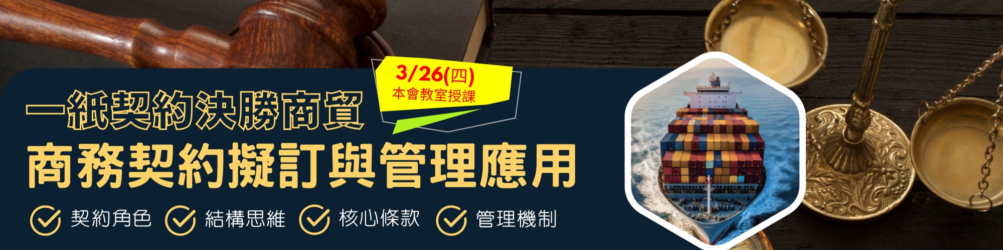 課程資訊 課程內容 效益及對象 時間地點 學員好評 備註說明 課程內容《上午》貿易契約關鍵實務 / 曹淑玉老師一、契約在貿易的重要性1.1 以OA為例圖解金流與物流1.2 貿易契約在交易流程的角色1.3 貿易契約的天堂路與地獄行二、貿易契約之10大雷區以案例說明貿易糾紛、貿易損失來自於誤踩契約雷區。三、貿易契約之5大架構 3.1 貿易契約的形式3.2 貿易契約之架構3.2.1 契約前文.要用心3.2 2 定義條款.要釐清3.2.3 基本條款.要敘明3.2.4 一般條款.要留意3.2.5 契約結語.要確認四、訂立契約應注意事項分享9大應注意事項以保障自身權益,並避免無謂的糾紛或損失。《下午》商務契約擬訂與管理 / 李永然律師、許啟龍律師一、契約之基本概念、成立之要件二、商務契約之基本條款定義條款、契約存續期間、通知條款、讓與及承擔條款、責任限制條款、不可抗力條款、聲明、保證與承諾條款、擔保條款、保密條款、合約的修改、違約條款、仲裁條款、紛爭解決條款、程序法及管轄法院條款三、如何運用契約之「條件」與「期限」與「違約金」,以便掌控契約效力與風險3.1契約之停止條件、解除條件、契約之期限3.2違約金之設計四、契約之無效、撤銷或終止與解除4.1法律行為之無效、撤回、撤銷4.2契約之終止、解除五、商務契約條件的擬定與應行注意事項六、常用之商務契約類型6.1買賣與採購契約6.2合資或合夥契約6.3獨家代理契約與經銷契約6.4保密契約6.5何與員工訂定營業秘密及競業禁止契約七、契約管理7.1契約履行管理7.2契約糾紛的管理 效益及對象預期效益1.本課程除以上契約基本內容介紹外,對於公司行號、商業組織所常用之契約類型,亦逐一介紹及檢視,俾使各企業人士能掌握與參考。2.透過本次課程,參與者對於契約之基本架構、契約之基本條款及契約之風險、各種常用類型之契約當有顯著瞭解並可實際運用。 適合對象中小企業主、企業經理人、各部門主管、業務部門、管理部門、銷售部門、法務部門人員,及對本課程有興趣者 時間地點課程日期:115/03/26~115/03/26詳細授課日期詳細授課日期關閉課程場次 上課時段:週四 09:30~16:30 授課時數:6 小時 課程編號:DT02MC041150005 主辦單位:台北市進出口商業同業公會-國貿學苑 上課地點:10樓1002會議室_台北市松江路350號10樓交通資訊:捷運行天宮站 4 號出口,出站後左轉,步行約 2 分鐘【地圖】 學員好評 全新課程 備註說明 課程諮詢 承辦人:李林謙(課程)、郭阿賓(報名)/電話:02-25813521 分機411、423/電子信箱:rick@ieatpe.org.tw、apin@ieatpe.org.tw 回前一頁 此段 JavaScript 提供回上一頁功能,若瀏覽器不支援 JavaScript,請使用鍵盤 Backspace 或瀏覽器回上一頁功能