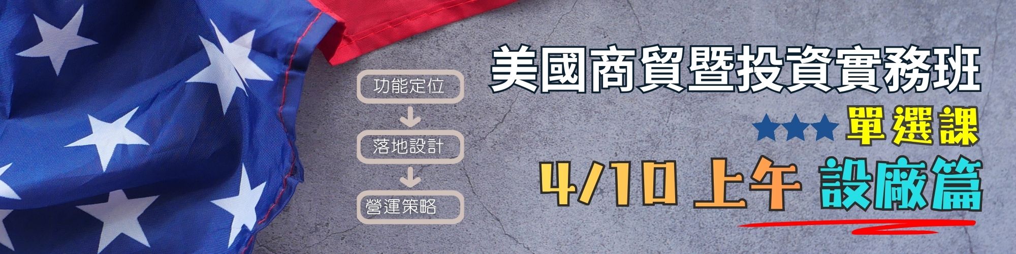 課程資訊 課程內容 效益及對象 時間地點 學員好評 備註說明 課程內容設廠篇:赴美設廠的要點與策略1.你要在美國「做一座廠」,還是「交付能力」?• 赴美設廠常見三種目的:交期/服務、供應鏈席位、風險控管2. 廠型與落地節點• 先決定「做什麼」,再決定「在哪裡」• 四種常見落地節點:製造廠(Manufacturing)、組裝/最後段加工(Final Assembly)、測試/品管/認證(QA/Testing)、倉儲/售後/服務中心(Fulfillment & Service)3. 營運策略• 在地化的三種程度:在地交付、在地組裝、在地供應鏈整合• 智慧製造/自動化:美國高人力成本下的必要解法 效益及對象預期效益1️⃣ 釐清設廠真正目的與定位2️⃣ 建立完整落地評估邏輯3️⃣ 提升在地營運與成本控管能力 適合對象1.預計進入或拓展美國市場的台灣企業主/主管及外派員工。2.涉及美國跨境投資、法律合規的企業專業人士。3.對國際商貿與美國市場有興趣的人士。 時間地點課程日期:115/04/10~115/04/10詳細授課日期詳細授課日期關閉課程場次 上課時段:週五 09:30~12:30 授課時數:3 小時 課程編號:DT02MC081150022 主辦單位:台北市進出口商業同業公會-國貿學苑 上課地點:3樓302會議室_台北市松江路350號3樓交通資訊:捷運行天宮站 4 號出口,出站後左轉,步行約 2 分鐘【地圖】 學員好評 全新課程 備註說明 課程諮詢 承辦人:李林謙(課程)、郭阿賓(報名)/電話:02-25813521 分機411、423/電子信箱:rick@ieatpe.org.tw、apin@ieatpe.org.tw 回前一頁 此段 JavaScript 提供回上一頁功能,若瀏覽器不支援 JavaScript,請使用鍵盤 Backspace 或瀏覽器回上一頁功能