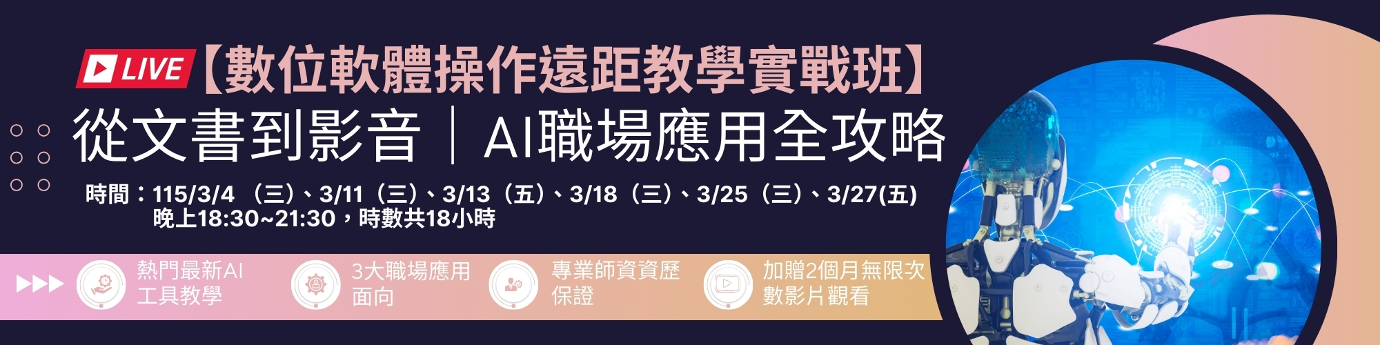課程資訊 課程內容 效益及對象 時間地點 學員好評 備註說明 課程內容⭐AI文書應用加值篇-AI基本觀念-常用AI工具介紹:ChatGPT / Gemini / NotebookLM /Grok-如何提問-網站分析及檔案分析-職場應用:撰寫文件、快速製作會議記錄、個人行程管理、工具模版應用、對話機器人、各式媒體成品⭐AI圖像設計實戰篇-如何生成圖片-AI編修圖片-職場應用:AI個人形象照、商品圖像應用、情境用圖、圖像問題解法方法⭐AI影音剪輯創作篇-撰寫腳本-生成式影片-虛擬人物製作-音訊處理-職場應用:快速製作宣傳影片、虛擬主播 效益及對象預期效益習得AI工具在職場上可應用的情境等,更學會生成式圖像應用工具等,藉以提升學員職能,強化企業競爭力! 適合對象企業負責人、產銷人發財各部門主管/人員等,及對AI軟體應用有興趣者。 時間地點課程日期:115/03/04~115/03/27詳細授課日期詳細授課日期115/3/4 (三)、3/11(三)、3/13(五)、3/18(三)、3/25(三)、3/27(五),晚上18:30~21:30,時數共18小時關閉課程場次 上課時段:週二、五 18:30~21:30 授課時數:18 小時 課程編號:DT02MC161140104 主辦單位:台北市進出口商業同業公會_國貿學苑 上課地點:線上_遠距教學 學員好評 從對AI只是平面文字的問答,提升到影音/圖像/會議/簡報多面向的應用學習,未來如有工作應用,將會使用這些技能。老師針對使用AI進行影音剪輯有詳細的講解,能針對公司宣傳的影片能有更多元的應用。 備註說明 ●課程保留退費說明1.【課程保留或轉讓】可於開課前擇一方式辦理異動申請,且僅限申請一次(1)將上課名額轉讓他人。(2)轉報其他課程班次。(3)申請保留課程,有效期1年,且不得再要求退費。2.【退費處理方式】(1)一日內課程開課前3日(含假日)以上提出退費申請者,退還已繳學費70%。開課日前3日(含假日)以後提出者,恕不予退費。若因人數不足或其他不可抗力因素致未能開班時,將全額退費。(2)一日以上課程開課日前及開課當日提出者,退還已繳學費70%。若於開課後上課總時數未達1/3前提出者,退還學費50%。若課程已進行超過1/3時數,恕不予退費。若因人數不足或其他不可抗力因素致未能開班時,將全額退費。(3)退費申請書退費須填寫退費申請書,並執原收據辦理,退費時間將依本會作業流程辦理。 課程諮詢 承辦人:彭依帆(課程)、郭阿賓(報名)/電話:02-25813521 分機413、423/電子信箱:yvonne@ieatpe.org.tw 回前一頁 此段 JavaScript 提供回上一頁功能,若瀏覽器不支援 JavaScript,請使用鍵盤 Backspace 或瀏覽器回上一頁功能