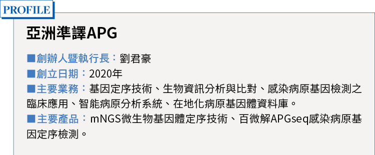 此外,亞洲準譯的分子檢驗實驗室成功取得CAP能力試驗認證,進一步提升檢測標準與可信度,而自主研發的APGPAS技術也於同年獲得中華民國專利,為基因體定序病原檢測技術奠定更堅實的基礎。劉君豪認為,亞洲準譯之所以獲得新創獎的肯定,正是因為公司長期投入大量資源與精力於研發創新,致力於提升基因定序技術的臨床應用價值。