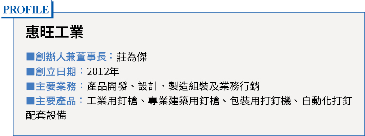 成立於2012年的惠旺工業,以工業用及建築用氣動打釘槍及零配件為核心產品,提供產品開發、設計、製造組裝及業務行銷等全方位服務。品牌創立約2年,推出一系列工業用氣動釘槍,滿足棧板製造業對極耐用釘槍的需求,快速在業界打出名號。隨著品牌發展,惠旺工業持續推出多樣化產品,包括工業用釘槍、專業建築用釘槍、包裝用打釘機等。成功站穩工業用釘槍市場後,更拓展至建築用釘槍市場,推出超輕量多用途釘槍。該產品以輕量化設計和精確準心技術為特色,為建築行業的從業人員,提供更高效、更實用的作業工具,大幅提升施工效率。